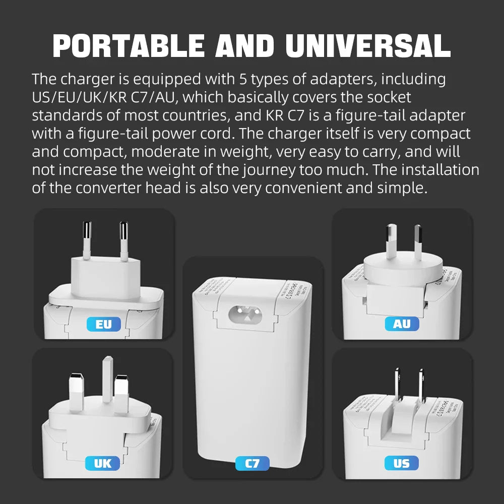 The charger itself comes as a complete set, including five types of adapters: US/EU/UK/KR C7/AU. The adapters are push-in snap-on, very convenient and simple. Note: For South Korea, it is a C7 adapter plus a power cord, meaning the South Korean specification is a T-shaped adapter with a power cord for South Korean standards.