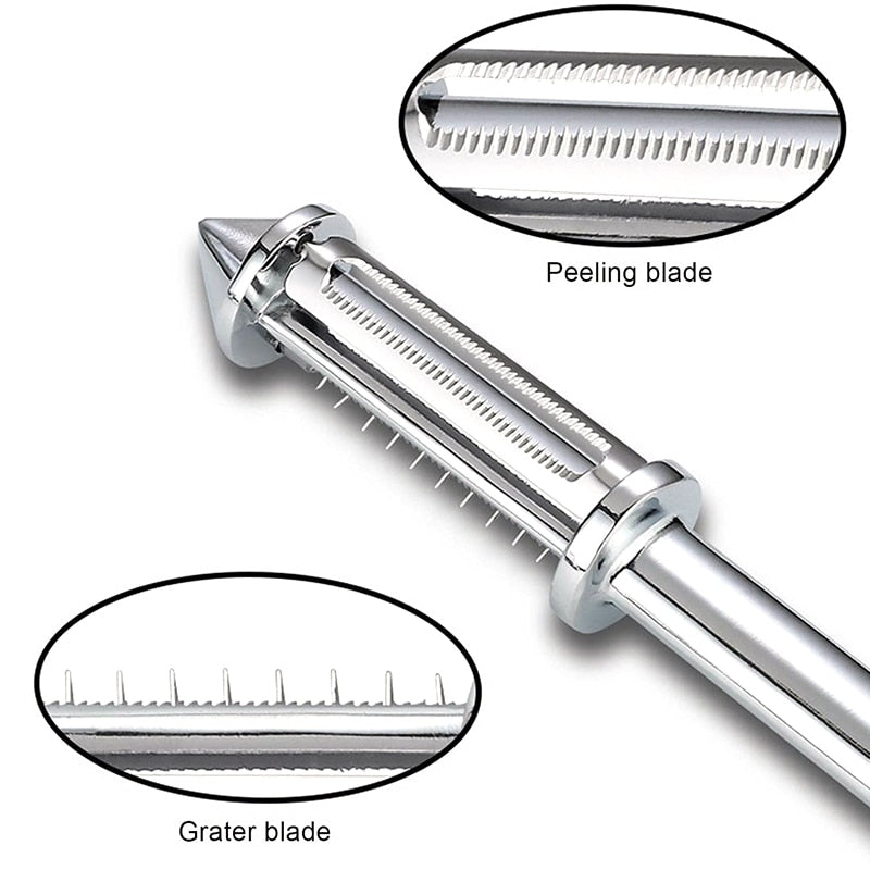 - Multifunctional Peeler - It has two different blades: standard blade and julienne blade, top of the julienne peeler can help you to remove the eye of vegetables and fruits conveniently. 3 close 1 design, can complete peeling, cutting, hole digging work, which makes your cooking process simple and more efficient.