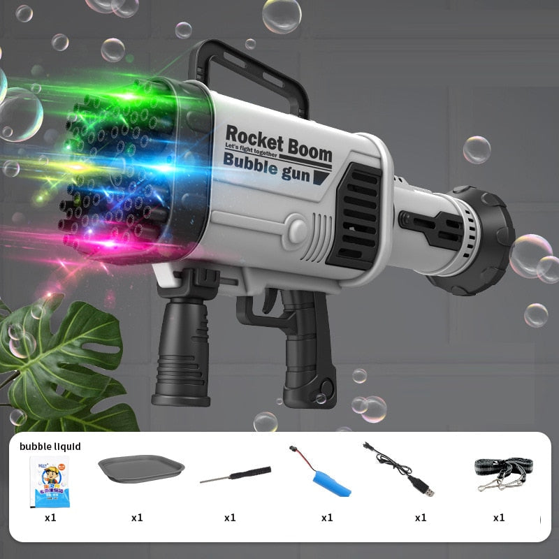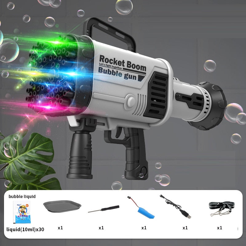 - NEWEST 69 HOLE ROCKET BUBBLE GUN - Our Bubble Gun requires no assembly. The Rocket Bubble Gun has 69 holes, a powerful cool fan, and cool lights at night. Hundreds of bubbles can be created. Colored bubbles can grab their attention when the bubbles are flying. More joy for you and your family.
