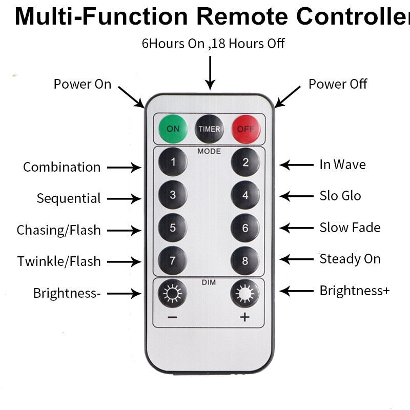 The twinkle lights string comes with 13 keys remote, you can easily use it to turn on/off, change the modes of lights, adjust the brightness (10 levels). Also, it will automatically keep 6 hours on & 18 hours off with the timer program once actived.