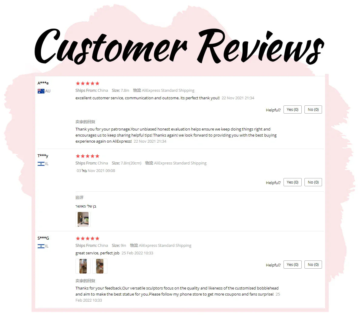 During the sculpture of the personalized bobblehead, our artist will send you the Head Proof, Body Proof And Finished Proof to get your approval for the next step. So please check the inbox of your email account regularly after purchasing.