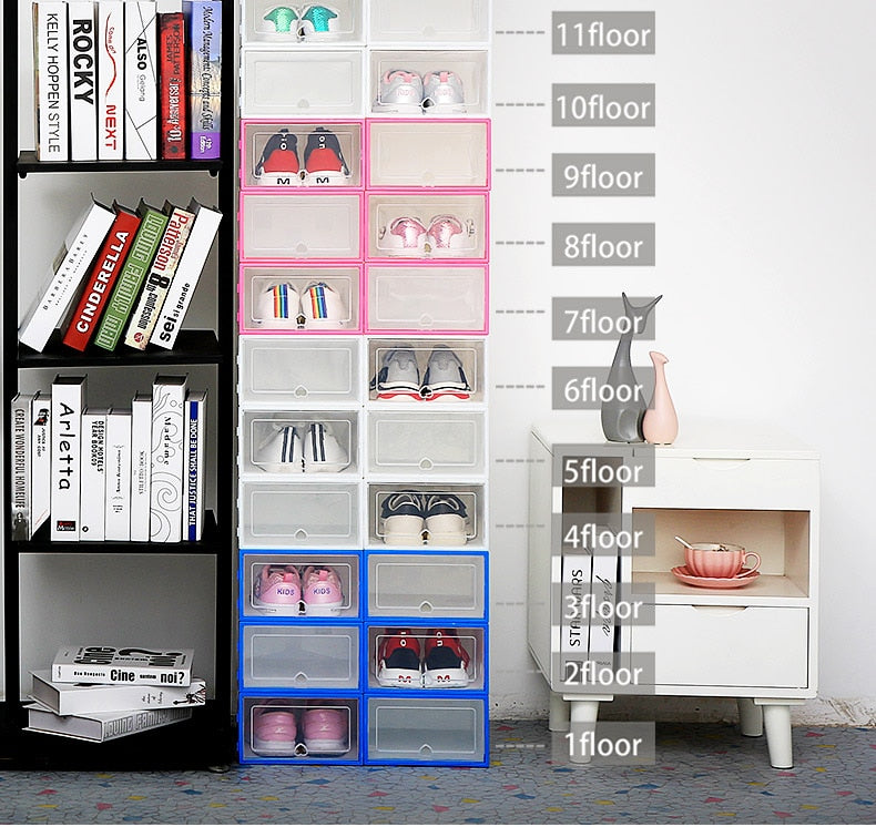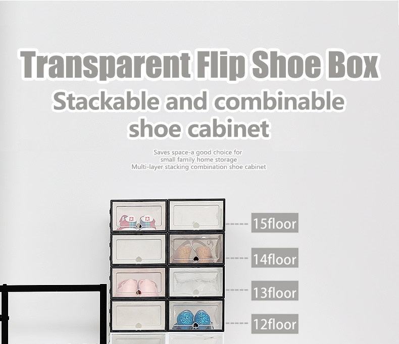 - Convenient:Our shoe storage boxes have drop front doors so you can easily access your shoes even when units are stacked or on a high shelf. The clear front and sides allow you to see what's inside at a glance.Say goodbye to the clutter