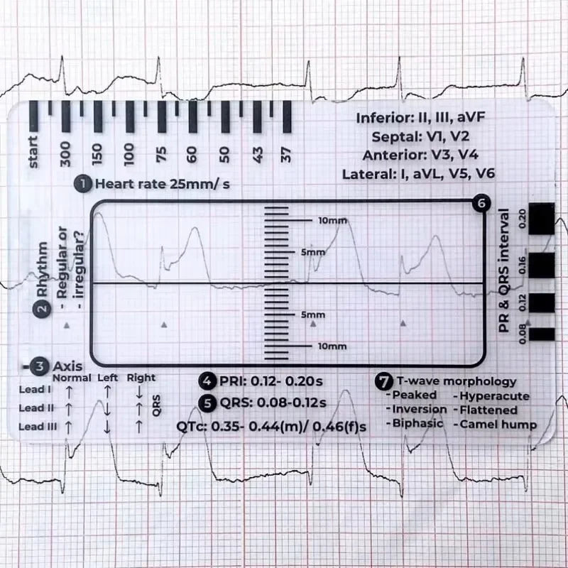 ECG 7 Step Ruler ECG/EKG assessment tool: A transparent ID sized card making ECG interpretation easy. Perfect sized to fit in your card holder for easy storage and access, specifically designed with the 7 step ECG interpretation method in mind. Anyone undertaking ECG/ EKG practise from a student up to an experienced clinician.