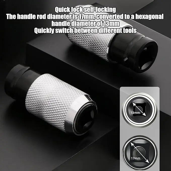 Convert to a 13mm hexagonal handle diameter and avoid accidental falls with our Impact Wrench Adapter's Quick Lock Design. The 17mm handle rod diameter ensures safety and stability during tool switching, while the quick lock self-locking function supports easy and secure transitions between different tools.
