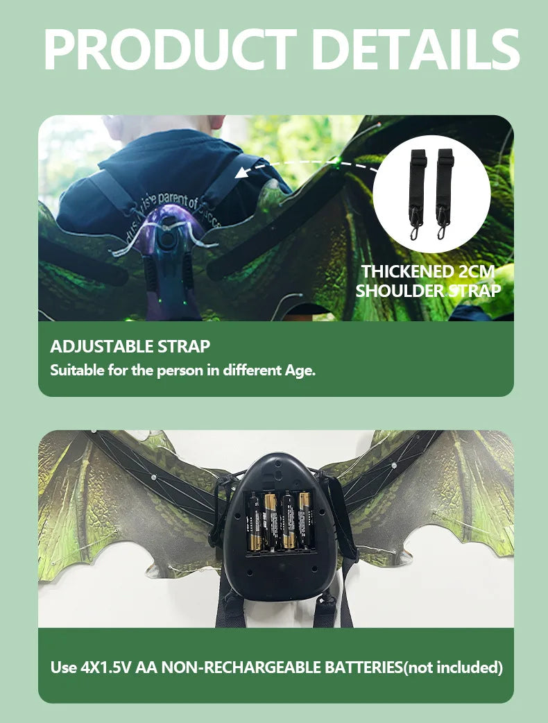 Safe & Durable: The main body of the backpack is made of material ABS, and the wing frame is made of customized mixture with strong flexibility and safety. Customized film is used for wings to match the theme elements and change color.