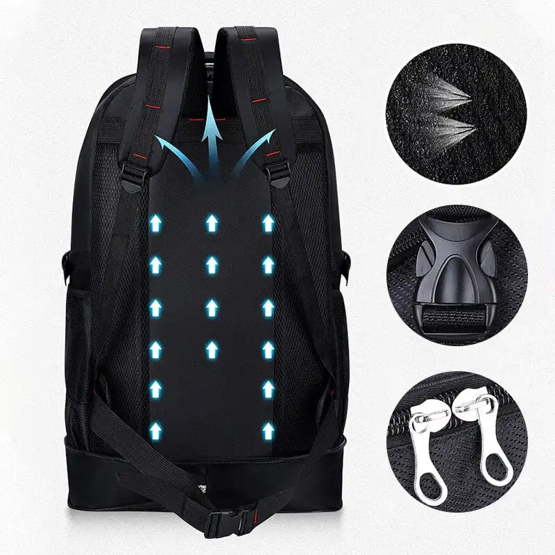 perfect for players,room for all their sports equipment and gear so they don't lose anything, A place for everything: Water bottles, umbrella, cleats, socks, shin guards, jacket, snacks. The most special is Outside pocket, it with adjustable compression straps that full sized basketball,rugby and volleyball.The best love for sports women, men