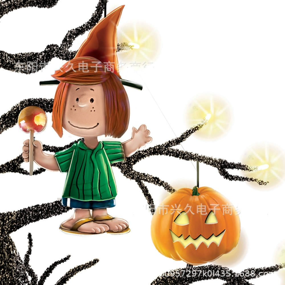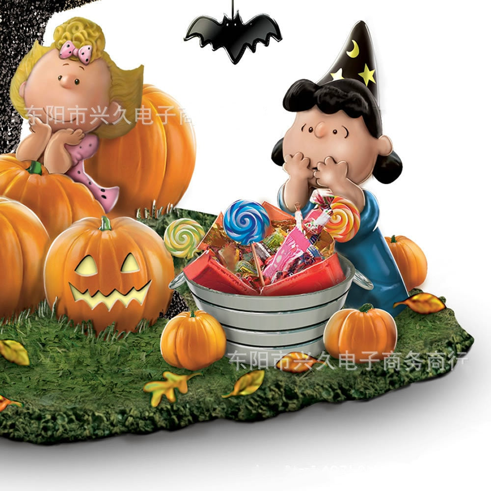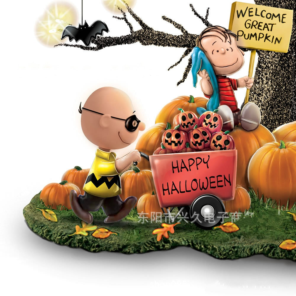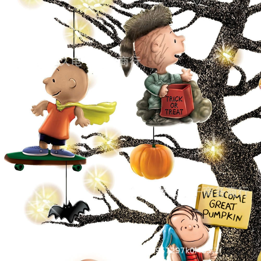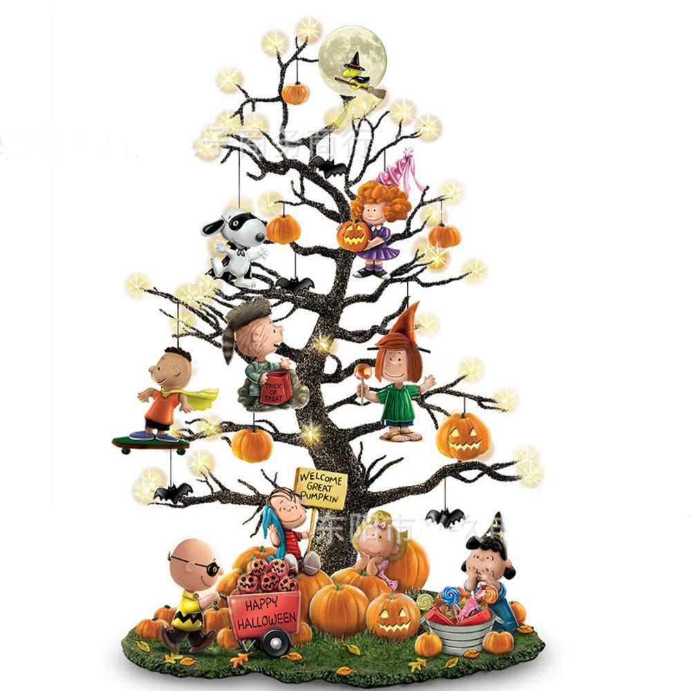 We also have a beautiful Halloween tree! showcases the characters as they celebrate Halloween. Its base displays Charlie Brown moving jack-o’-lanterns, Lucy enjoying candy after a night of trick-or-treating, and Linus and Sally awaiting the Great Pumpkin.