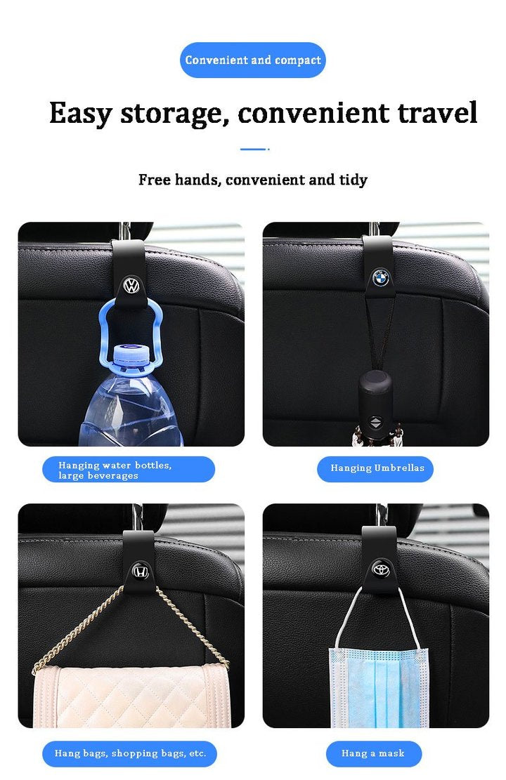 - Organize the space in the car: it turns your car headrest into storage space so you can keep the car clean and tidy, the headrest hook can hang groceries, handbags, purses, school bags, umbrellas, water bottles, shopping bags, baby products, wait more.