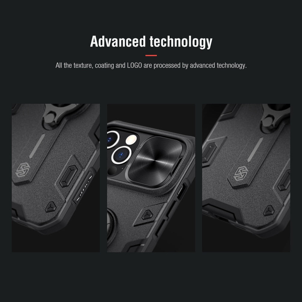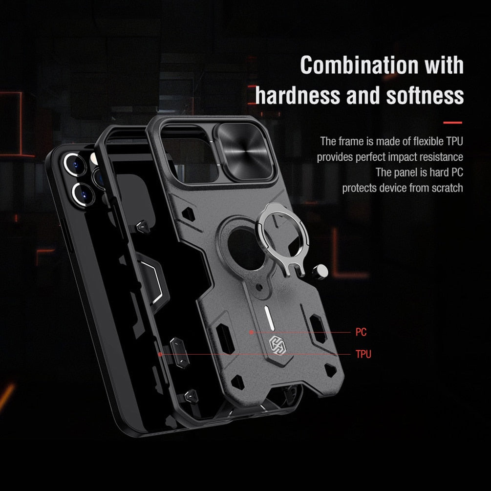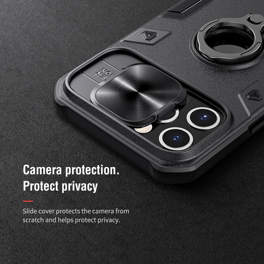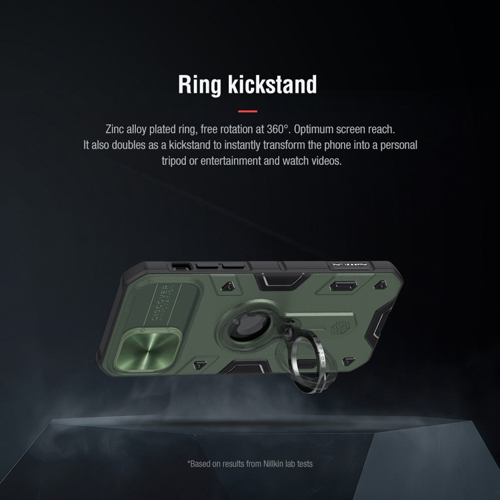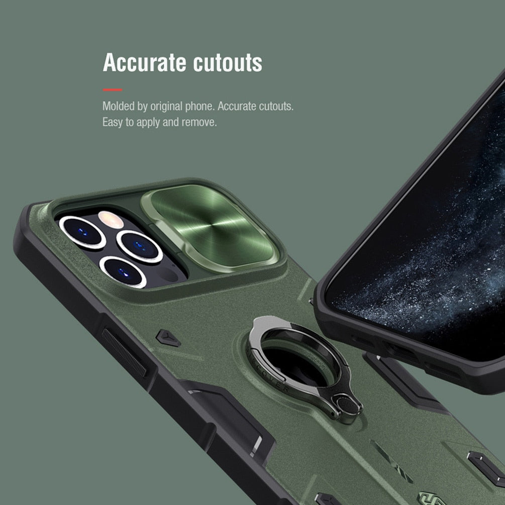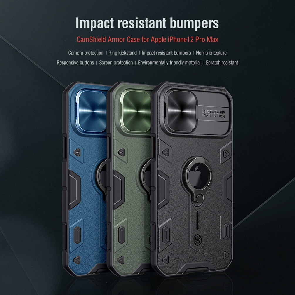 - Nillkin CamShield bulletproof case with sliding camera cover and ring stand, suitable for Iphone 12.