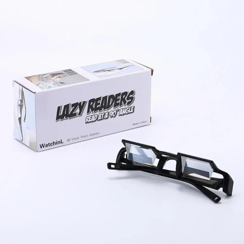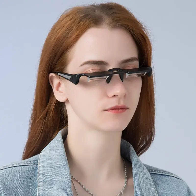 【90° 】 Turn your view to a downward 90 degree angle; Glasses do not magnify or focus images, but simply tilt images at a 90-degree angle in order to view vertical images while in a horizontal position; Users need wear their usual eyewear with prism spectacles if necessary, such as Myopia, Presbyopia, Astigmatism