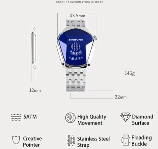 The design of the watch is inspired by the streamlined shape of a sports car. The craftsmanship of diamonds makes the watch more cool and has a strong visual impact.
