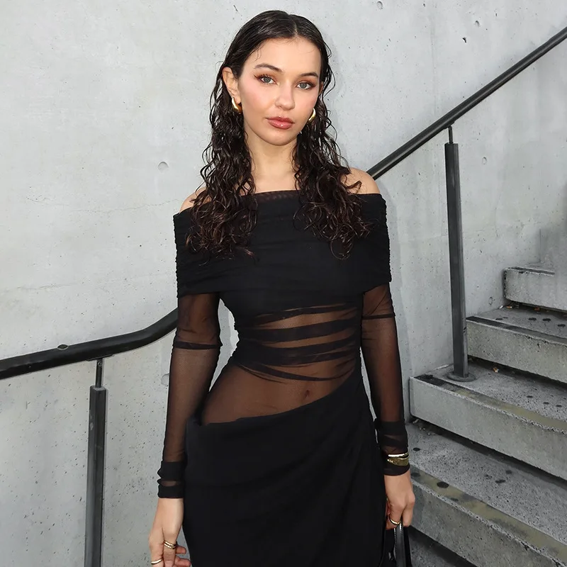 Make you the focus of the party,Plain Off Shoulder Ruched Sheer Mesh Dress, Elegant Long Sleeve Long Dress for Party Banquet