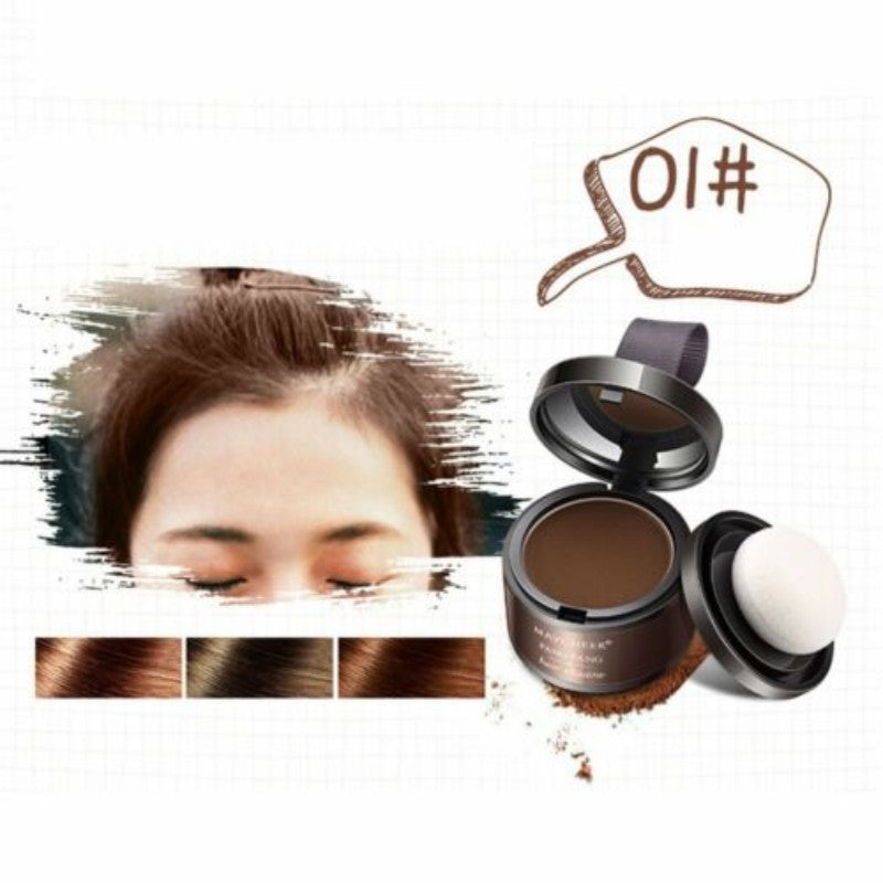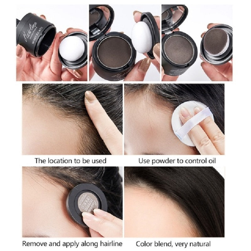 Open the puff in the bottom dipped in the amount of hair powder, along grey hair line root dipped gently tap, fill out the color of the neat hairline.