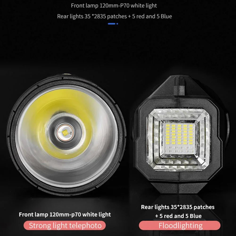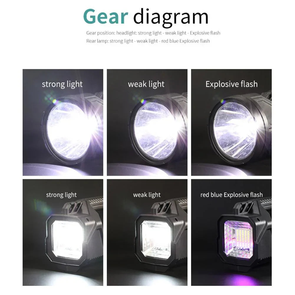 4. Multi-gear mode: gear: headlight: strong light and weak light burst; Tail light: strong light, weak light, red and blue flashing; (Safety warning, including lighting, emergency light, safety assurance, on-board emergency red and blue warning lights).