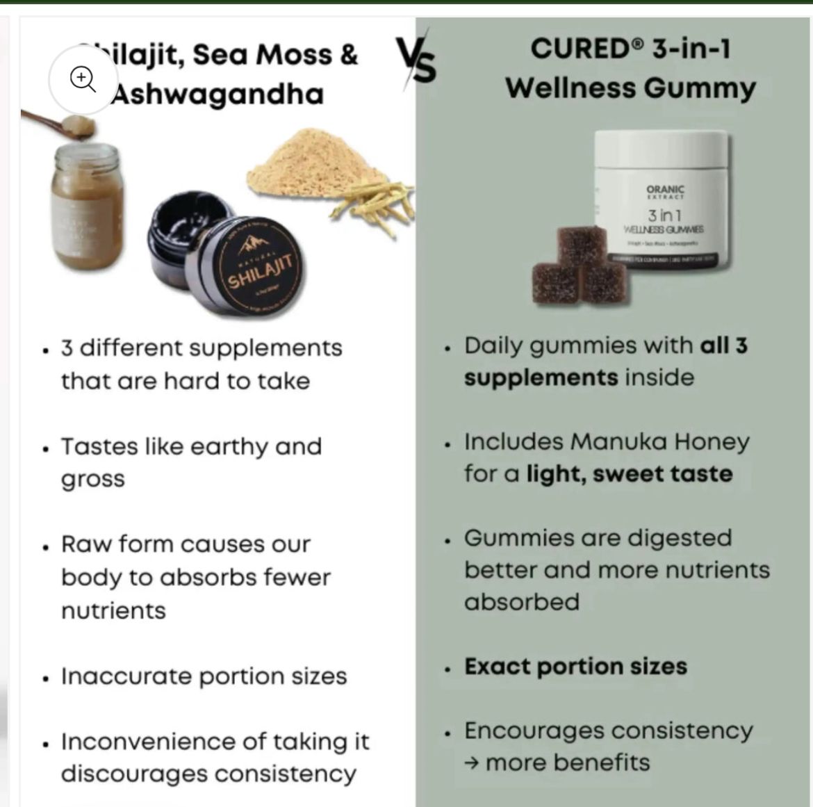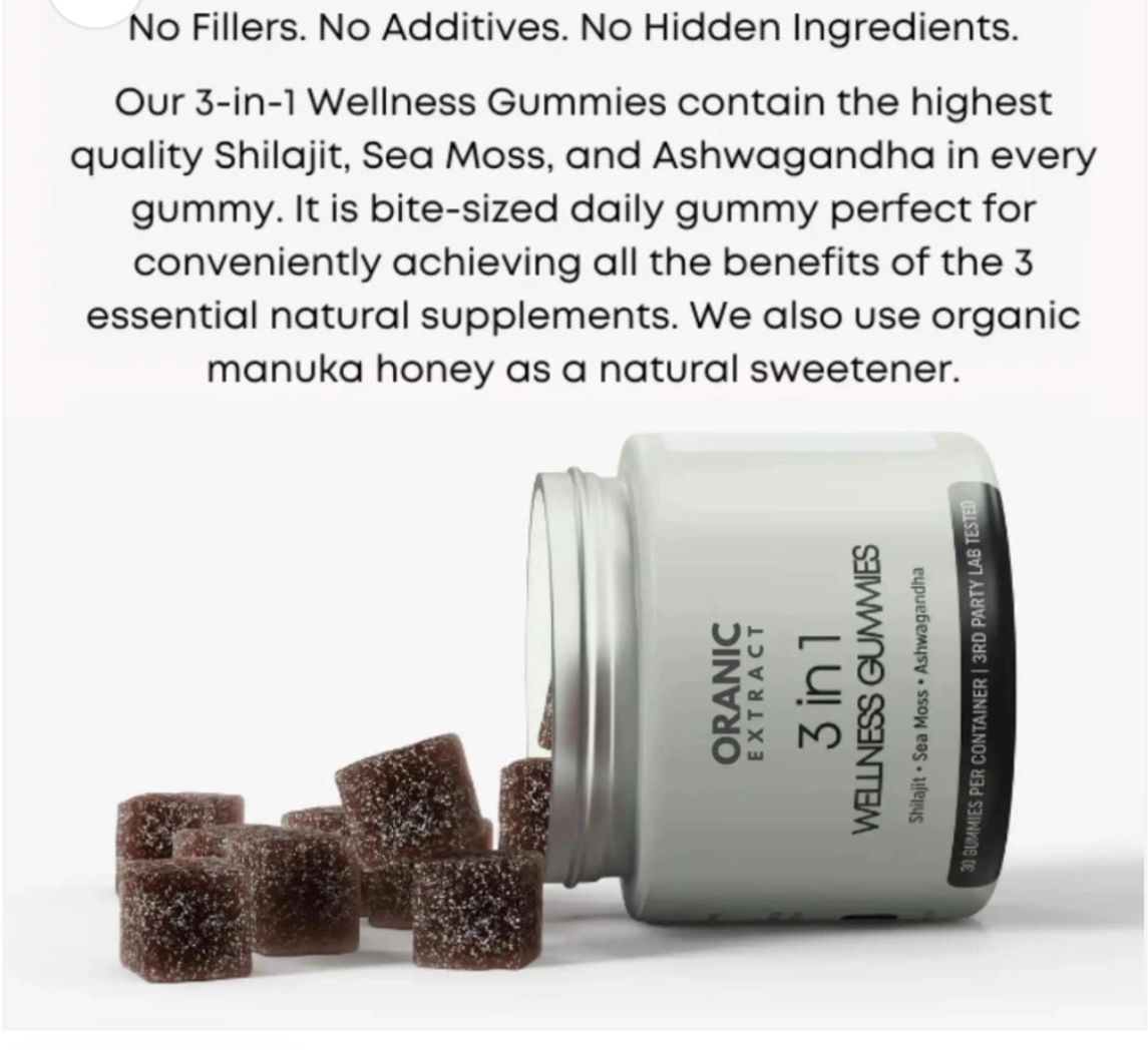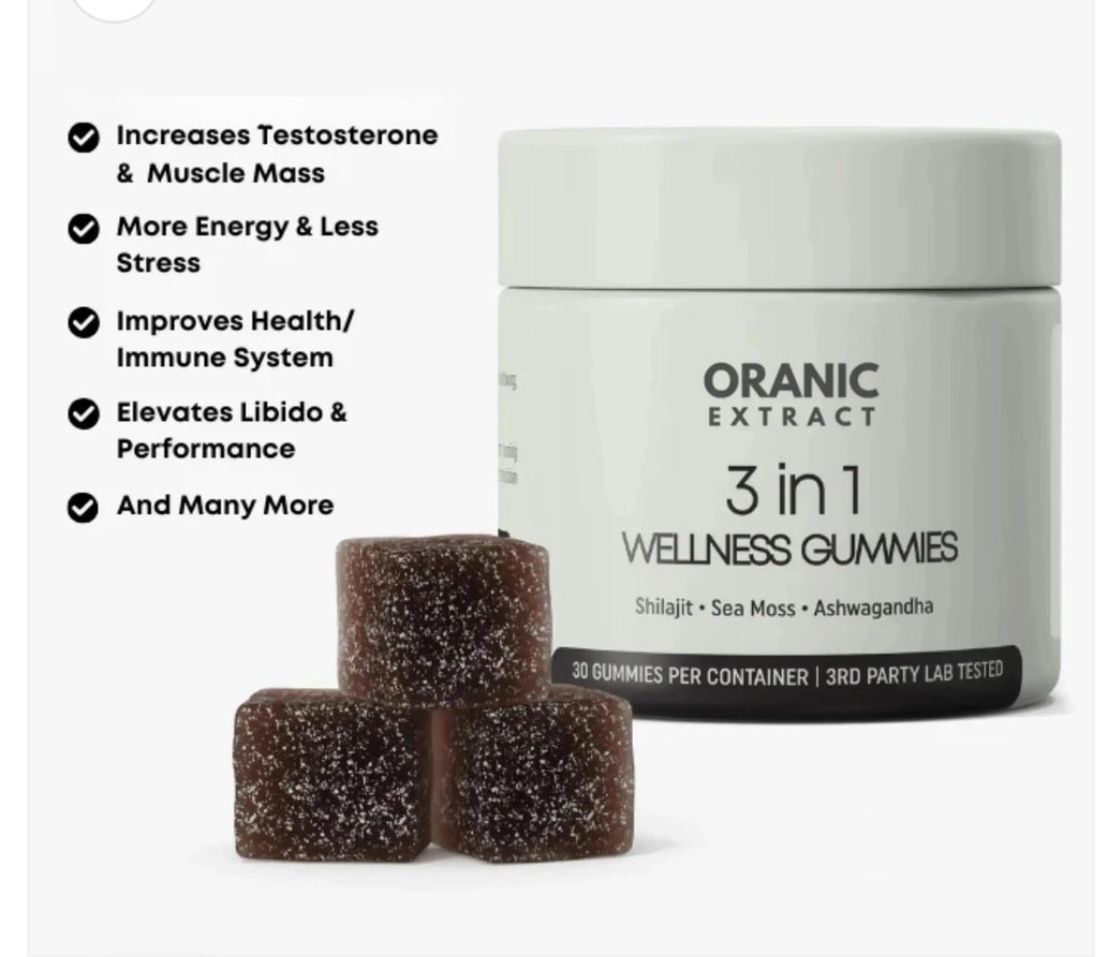 ur ORGANIC EXTRACT® 3-in-1 Wellness Gummies packages all the benefits of Shilajit, Sea Moss, and Ashwagandha into a daily bite sized gummy. Take 1 per day and easily achieve all the benefits.