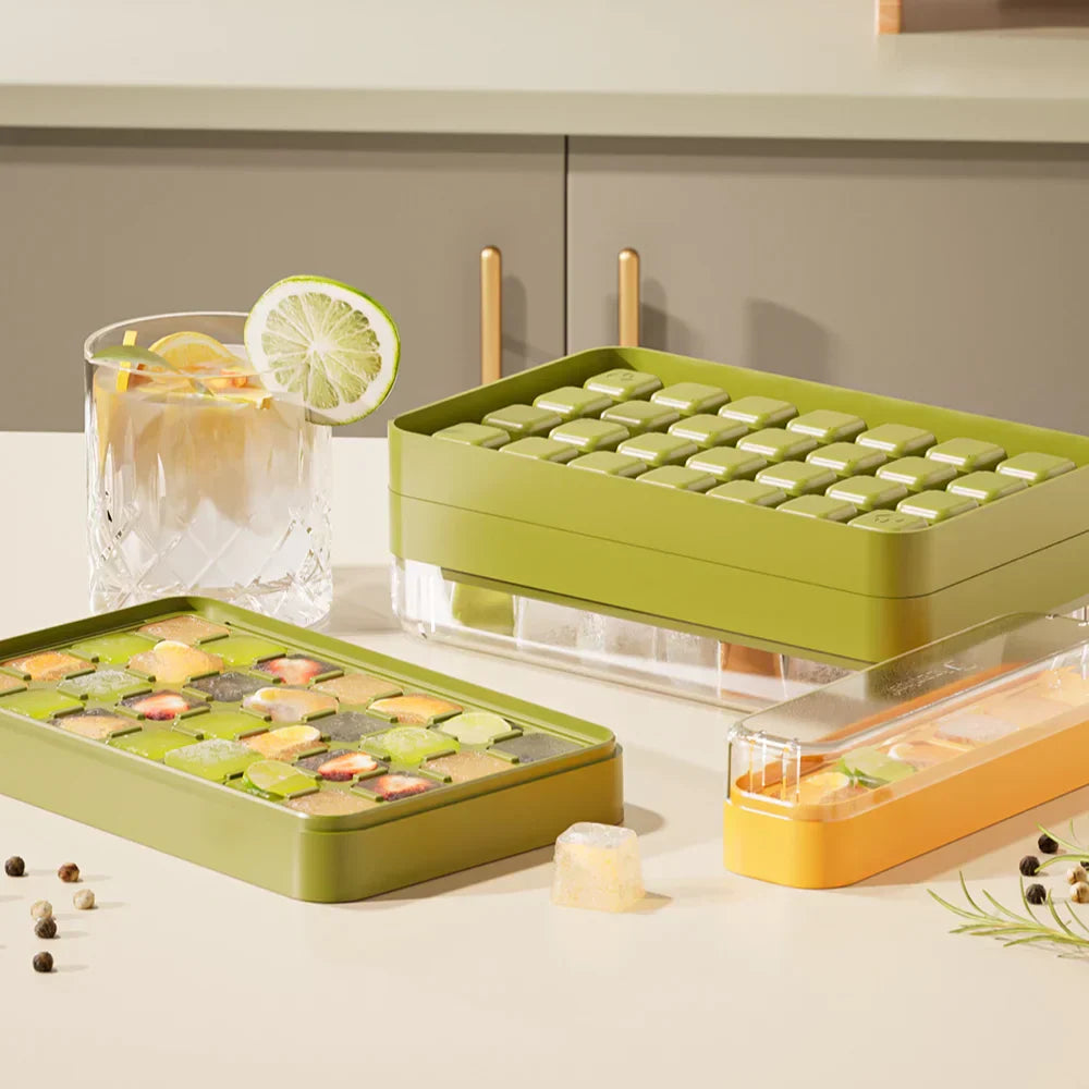 ---Innovative Press Design: Our ice cube tray releases cubes more easily with upgraded button design. You can turn the ice cube tray upside down on the ice box and press the ice button on the lid to get ice cubes.