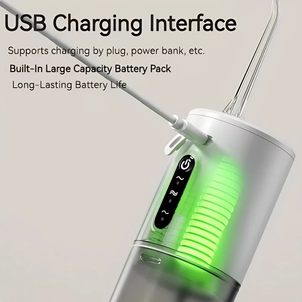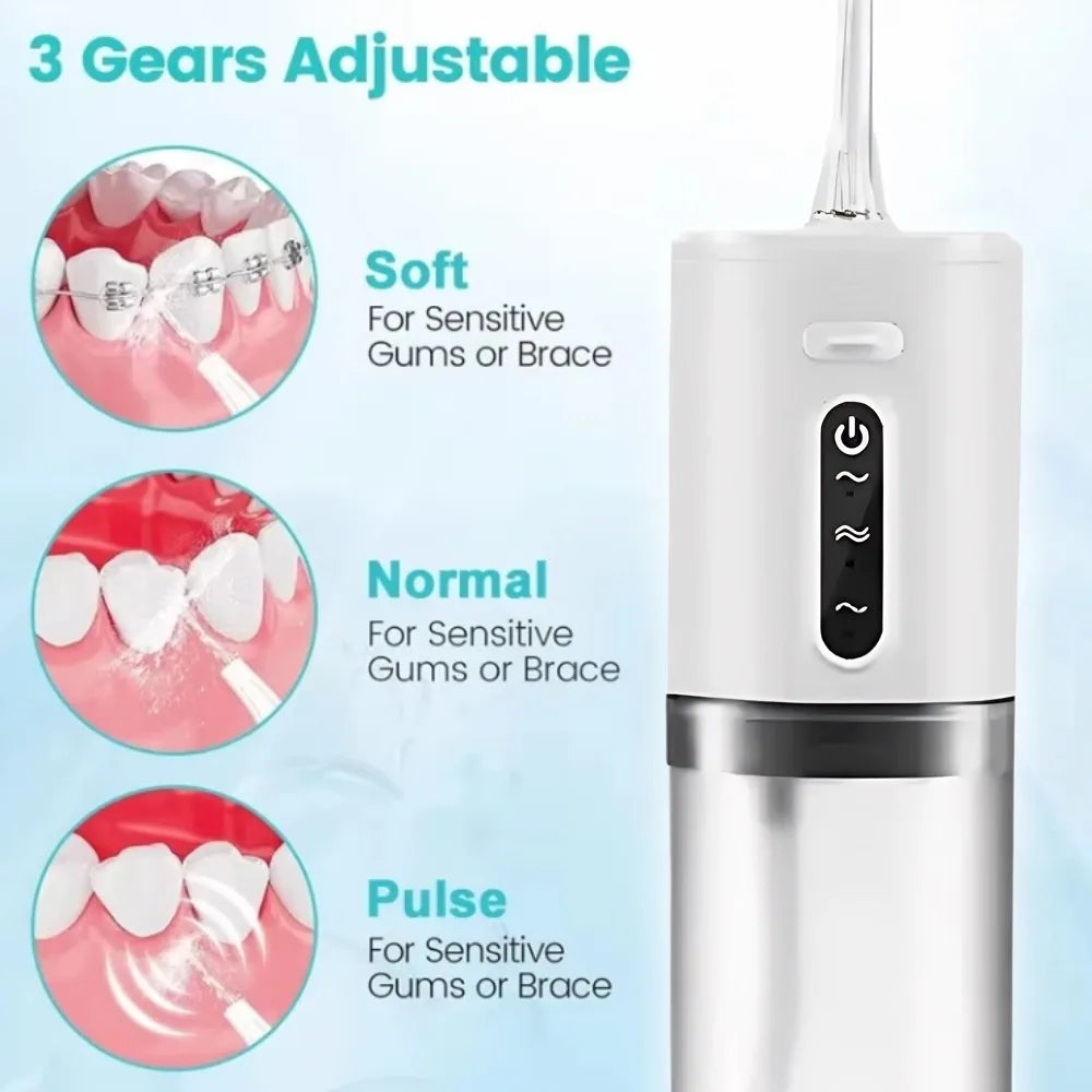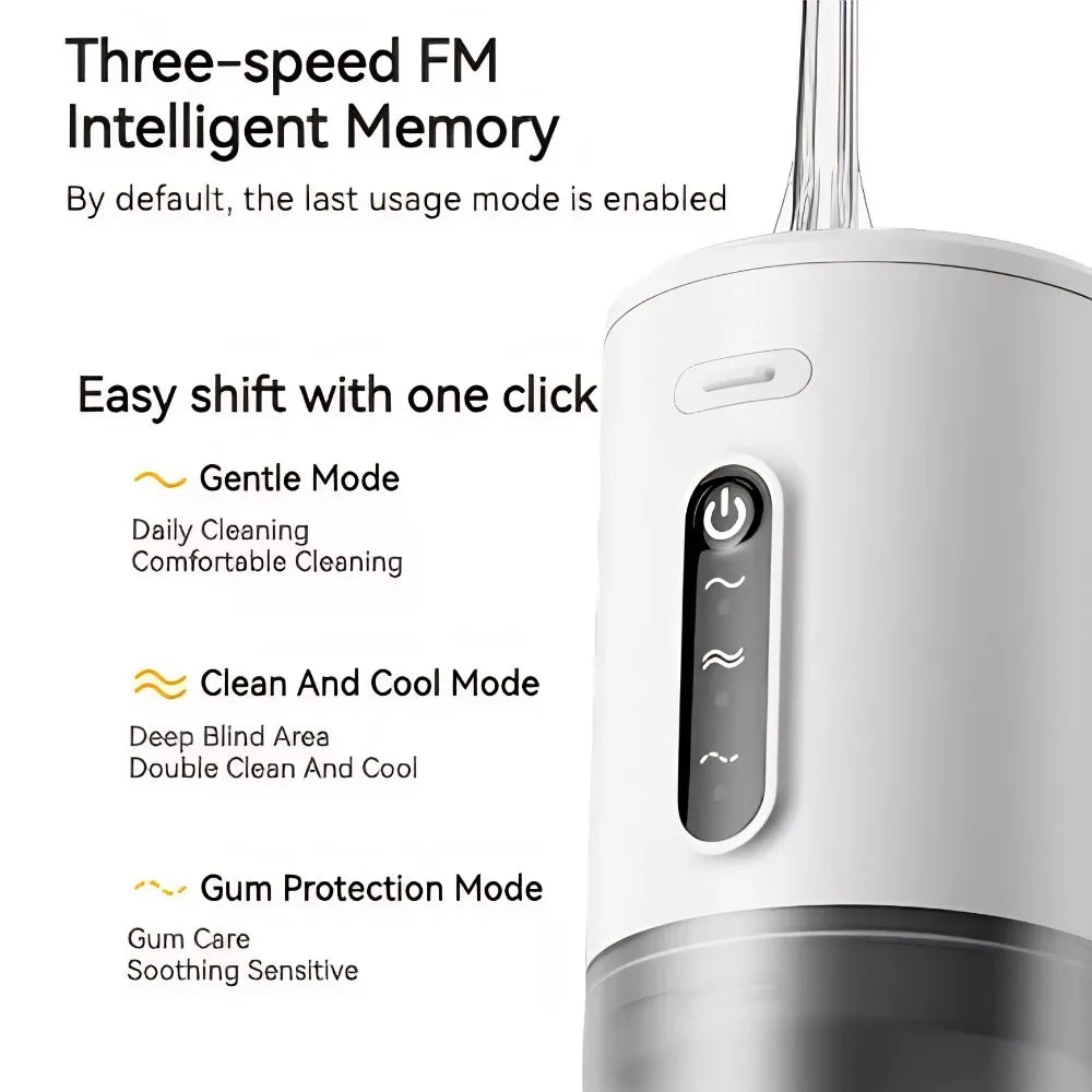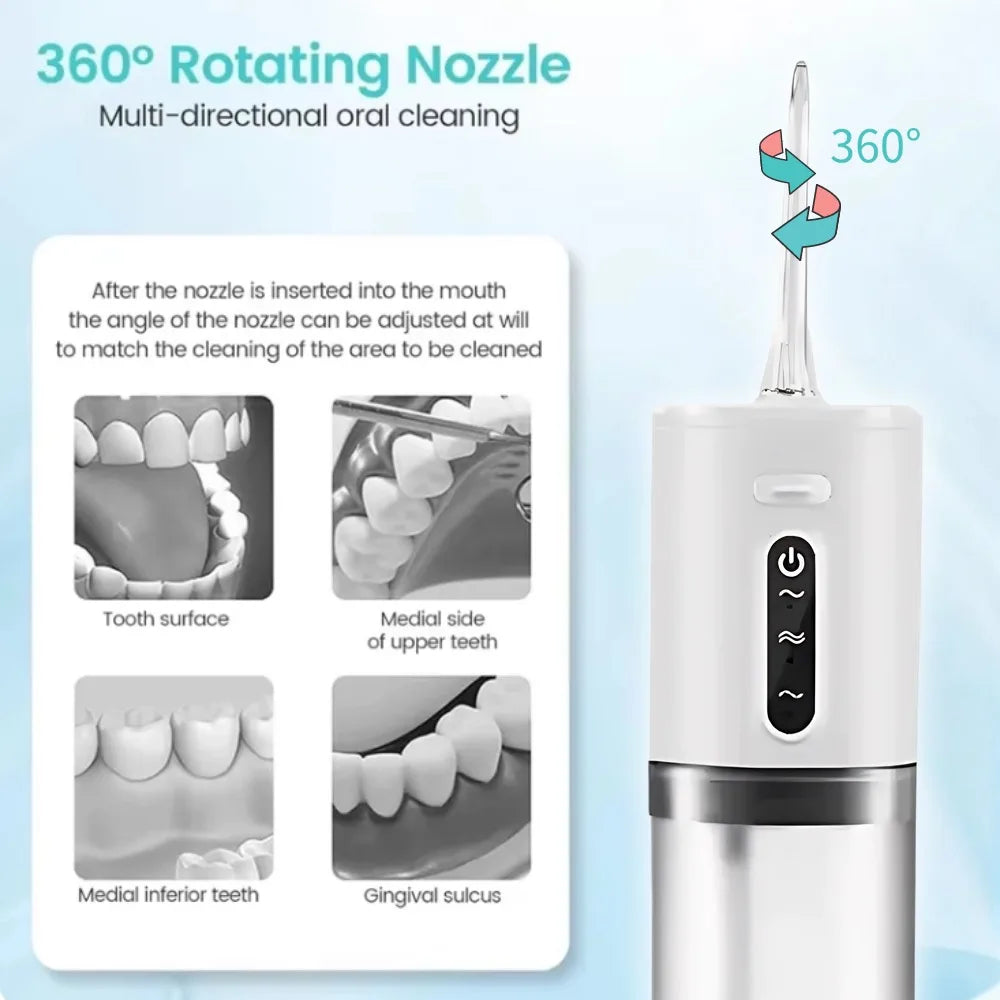 2. One-button intelligent switching, three-speed adjustment mode (low mode/high mode/pulse mode) can meet different cleaning needs and help improve your oral condition.3. The nozzle made of food-grade materials can rotate 360° to clean the inside of the mouth from multiple directions, such as the tooth surface, the inside of the upper teeth, the gingival sulcus, etc.