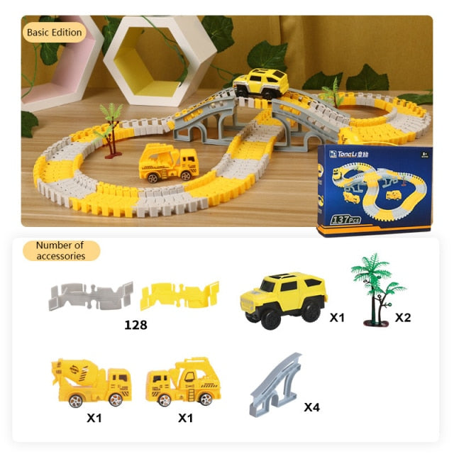 The package includes 333 pieces - flexible tracks, cars and numberous accessories. It is easy to assemble and take apart to store. The flexible tracks can be twisted, turned, flexed to layout endless possibilities shapes to inspire your child’s creativity & imagination and exercise hand-eye coordination.
