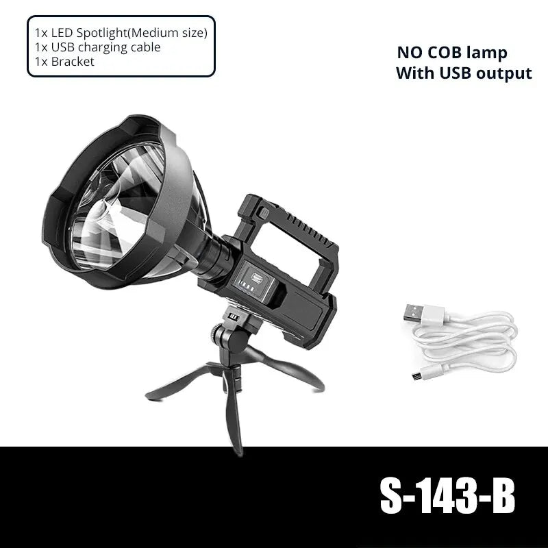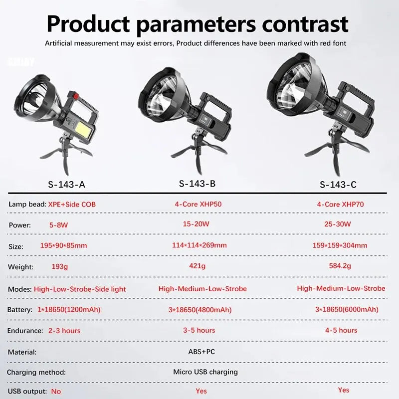 * Large sizes and super bright: large size, high-power spotlights, there is an adjustable bracket at the bottom of the spotlight to support light, liberate your hands. The Super Bright 4 Core LED chip provides the brightest 3800 lumen light. The long lighting range is 500 meters to make it long-distance lighting.