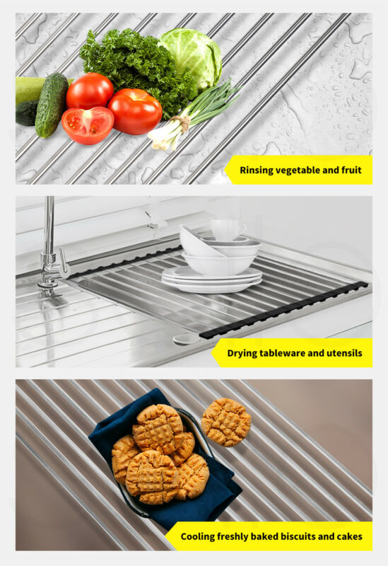 MORE COUNTER SPACE FOR LIFE: Over the sink dish drainer for air-drying washed bowls, pot, fry pans, tableware, cookware, cutlery, and so on; vegetable colander and prep works platform over the sink.