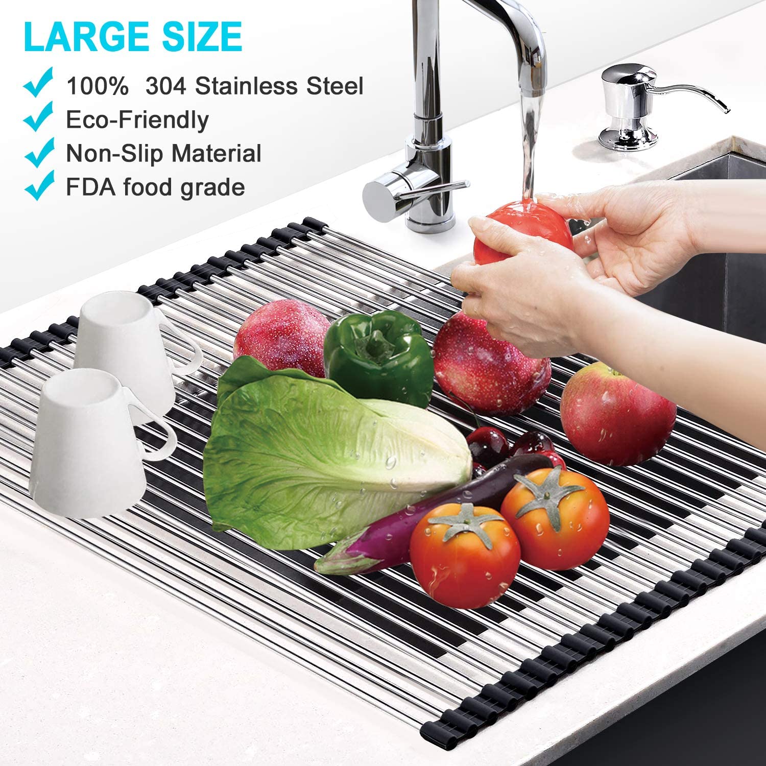 MORE COUNTER SPACE FOR LIFE: Over the sink dish drainer for air-drying washed bowls, pot, fry pans, tableware, cookware, cutlery, and so on; vegetable colander and prep works platform over the sink.