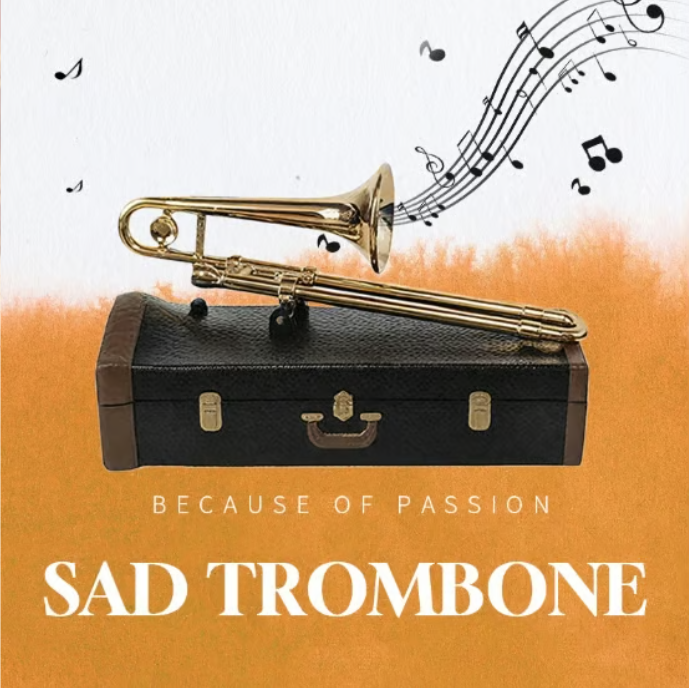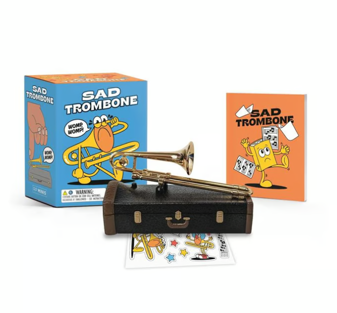 Miniature, Mighty & Hilarious – 3" trombone replica resting on a realistic trombone case base.