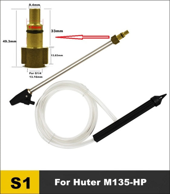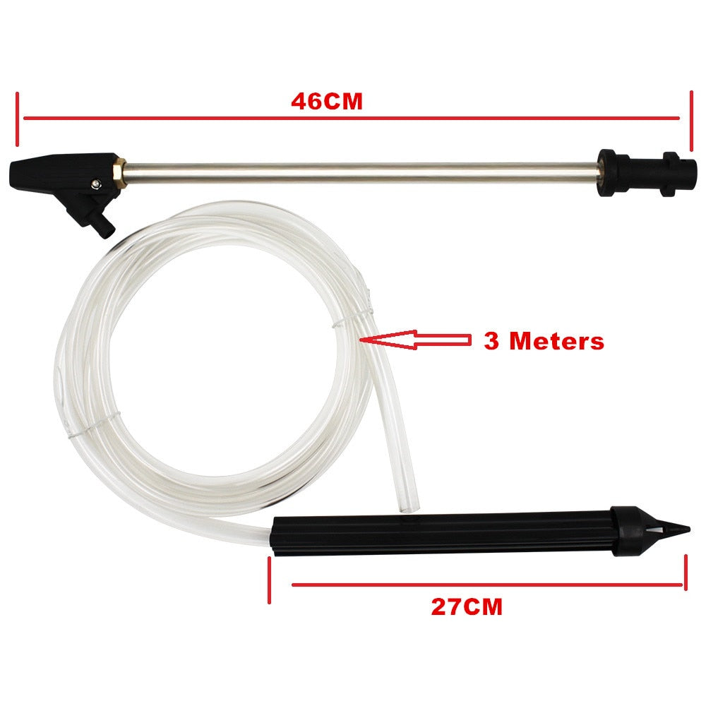 Using a suction-fed injection system: sand is fed into the water using the pressure of your pressure washer that sucks the sand meeting at the end of the attachment.