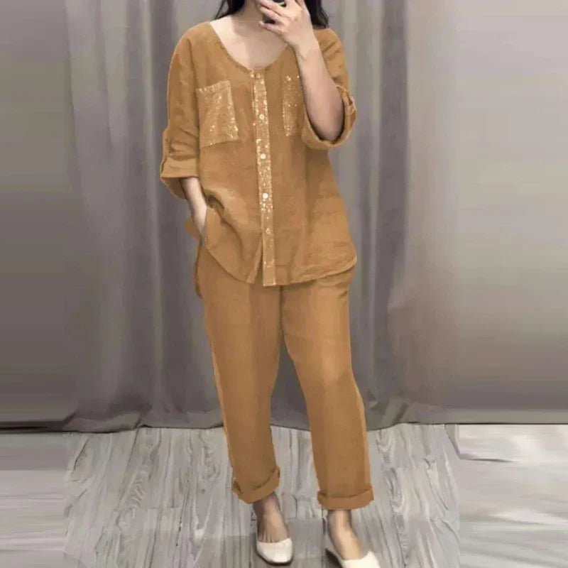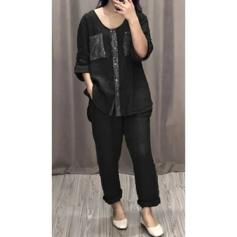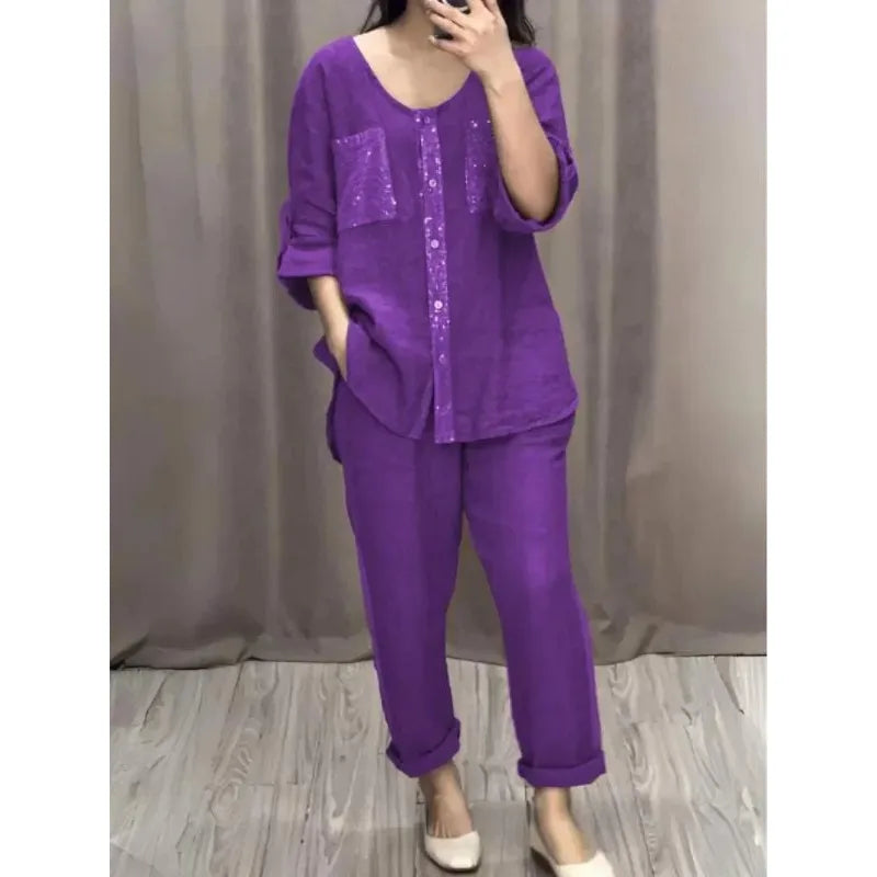 Sequined Round Neck Mid-sleeve Two-piece Suit