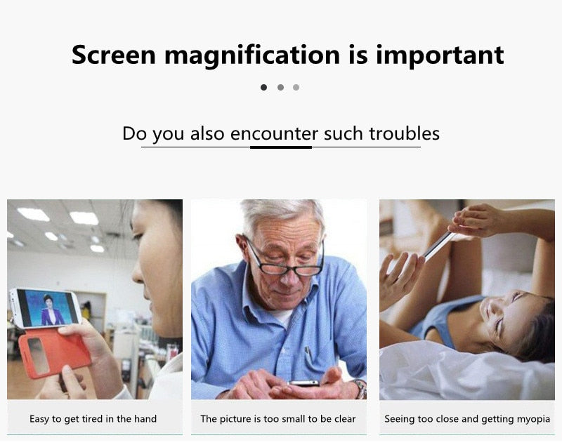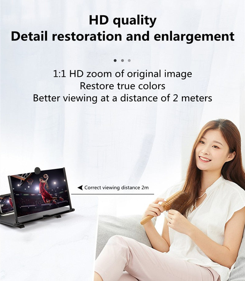 This amplifier features an HD advanced optical technology to magnify screen of your devices without blur/distortion. By magnifying, it effectively relieve visual fatigue and discomfort that comes from prolonged focusing on small screen. Watch movies comfortably and get cinema-quality experience now!