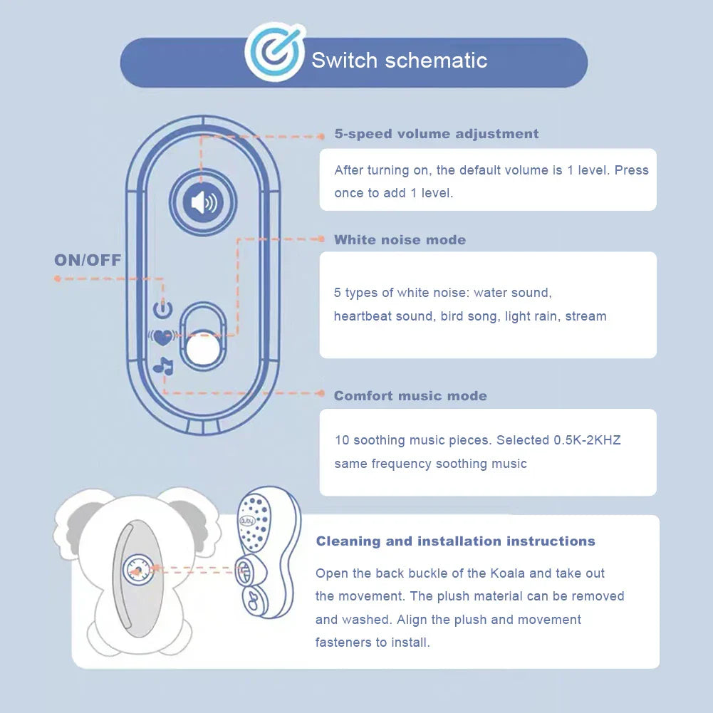 Feature: 1. Premium Quality Material: Our breathing koala is crafted from soft plush material covered with pearl non-woven fabric, making it incredibly soft and perfect for comfortable cuddles. This baby sleep and playmate koala is designed to be a gentle companion for your child, ensuring a cozy embrace. 2. Rich Sleep Companion: Equipped with a variety of calming noises and lullabies, along with sensory lights and sounds, this musical stuffed plush toy creates a tranquil environment conducive to sleep. It helps your child drift off peacefully, promoting relaxation and well-being. 3. Comforting Koala Friend: The baby soothing koala plush doll is the perfect partner to help your little one achieve peaceful sleep. With its calming sounds, music, and rhythmic breathing motion, it aids in creating a serene atmosphere for a restful night. 4. Cherished Gift: The soothing music baby sleeping companion combines auditory and tactile stimulation to soothe children, making it an ideal gift for promoting peaceful sleep. Its comforting and charming presence makes it a wonderful present for any occasion. 5. Easy to Carry: Designed for travel, this adorable soothing koala plush doll is easy to transport, ensuring your child feels calm and relaxed wherever they go. Its portable design allows your child to enjoy the comfort and tranquility of their koala friend on any adventure.
