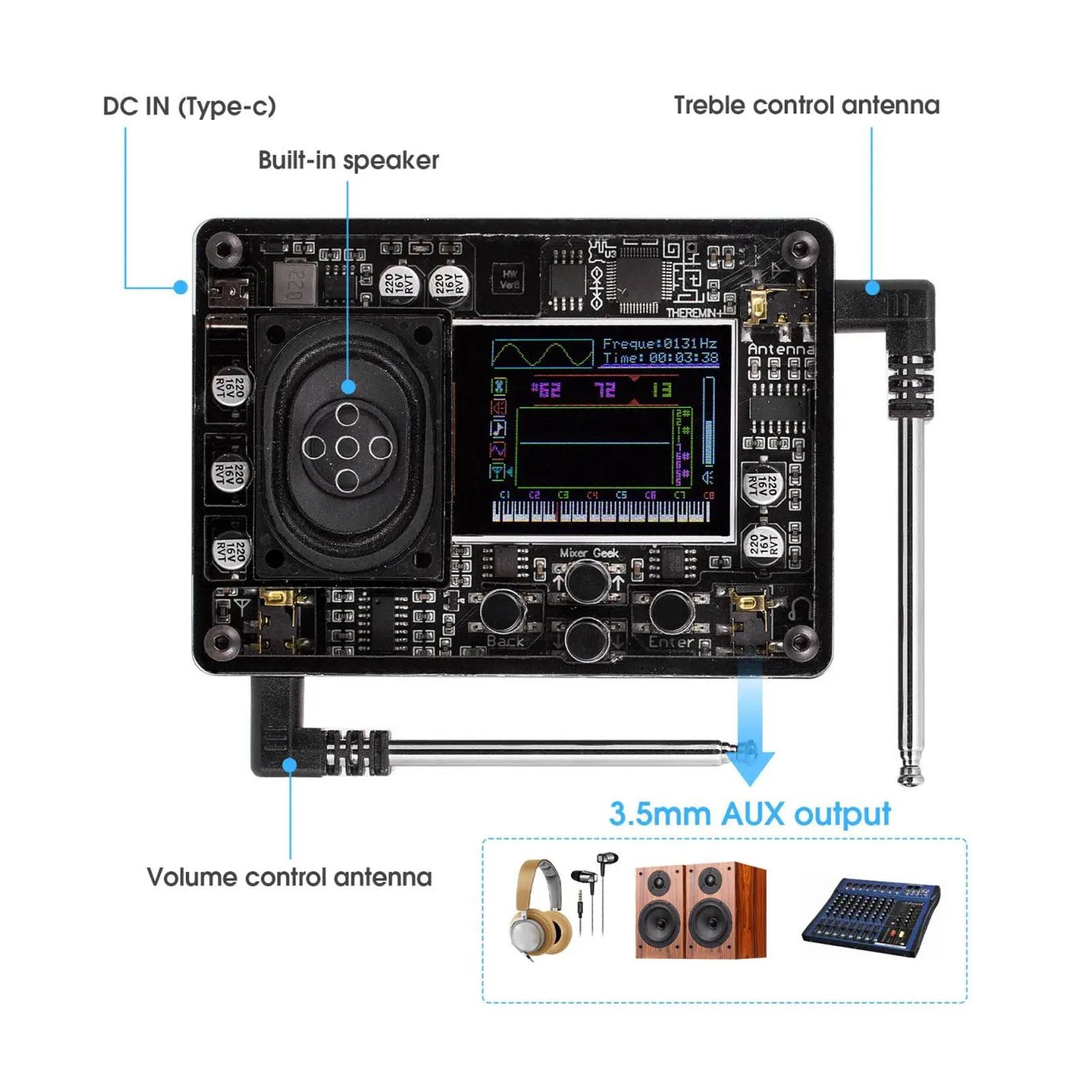 1. Easy to Use: Perfect for beginners or experienced musicians, mini theremini's assisted pitch correction feature allows each player to adjust the instrument's playing difficulty level, develop your musical talent, and improve your pitch accuracy.2. Color Display: Mini theremin with a color display, which can display the waveform, time frequency, volumes, as well as the tone indicator and corresponding piano tone display.
