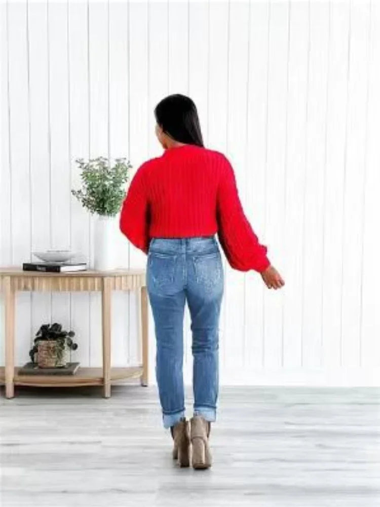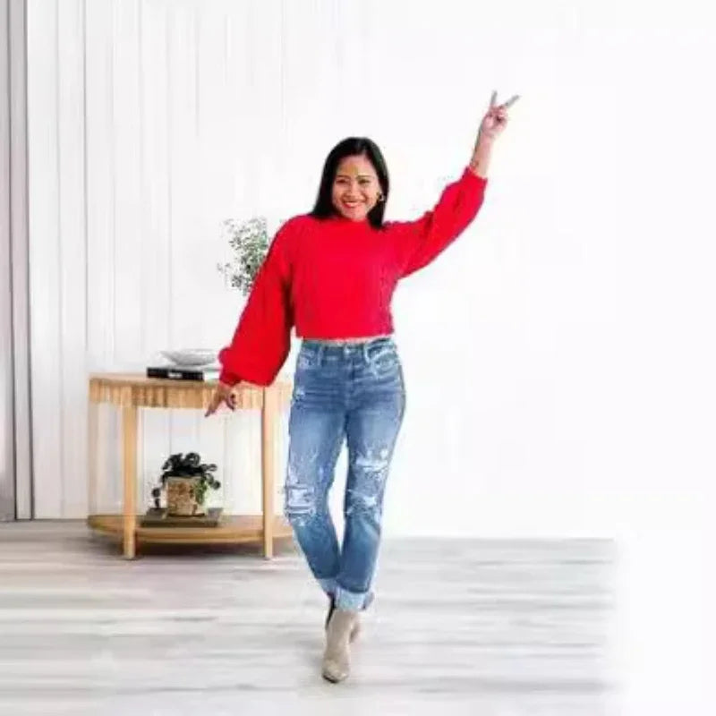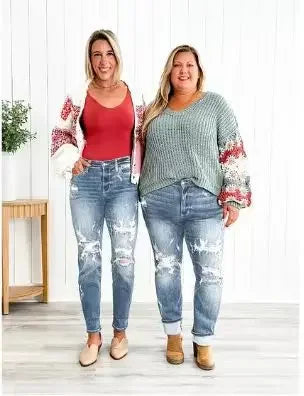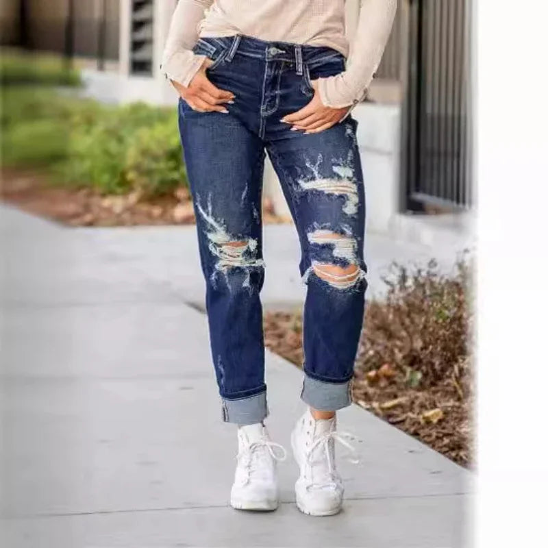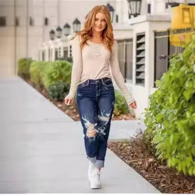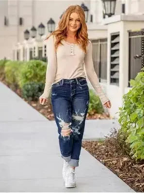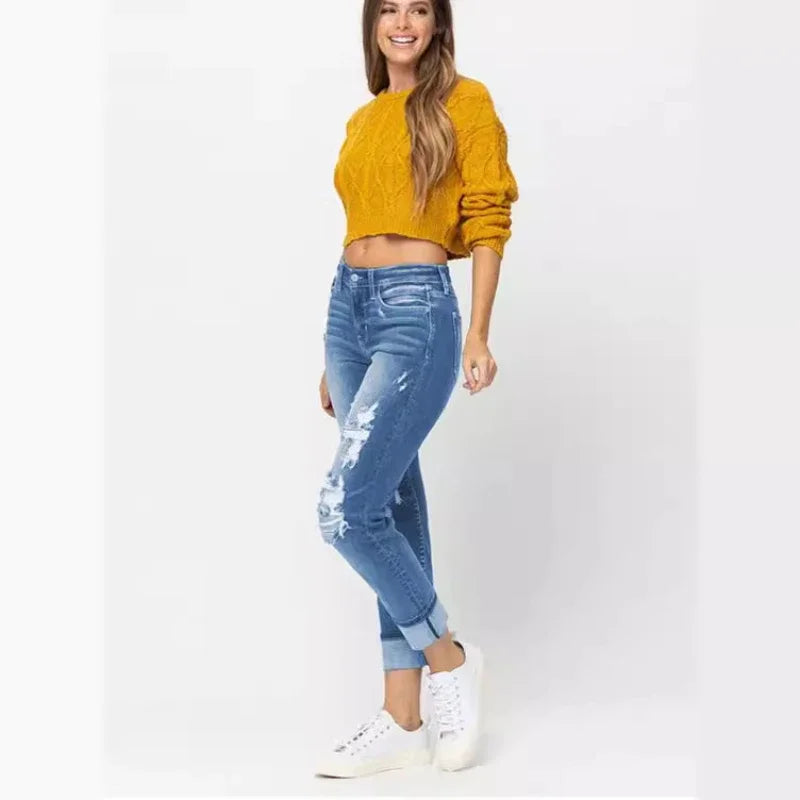 Tummy Control Distressed Cuffed Boyfriend Jeans