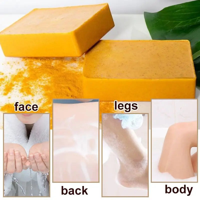 HOW TO USE - Start by moistening your skin with warm water, then evenly apply the turmeric soap onto your skin. Massage for 20-30 seconds, and finally, rinse thoroughly with clean water.