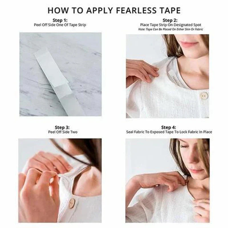 Fearless double-sided tape will hold your clothing and hemlines comfortably against your skin or undergarments to keep your outfit refined, classy, and elegant all day long. No more embarrassing slips, visible straps, or sagging necklines. -