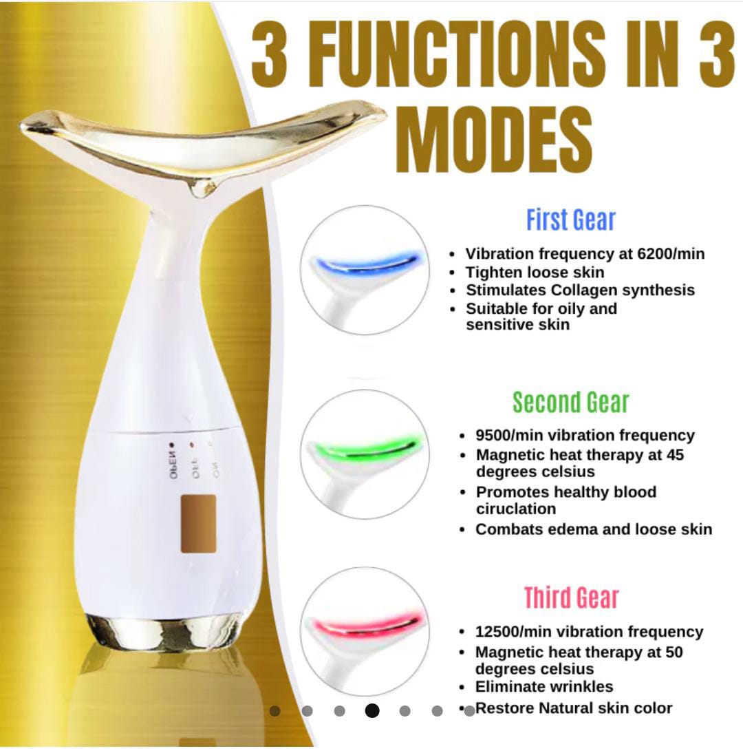 Multi functional neck beauty massager, this neck beauty massager combines massage, hot compress, color light, vibration, and EMS to effectively reduce neck wrinkles, fine lines, and wrinkles, improve and tighten the skin, aiming to create a swan neck for you.