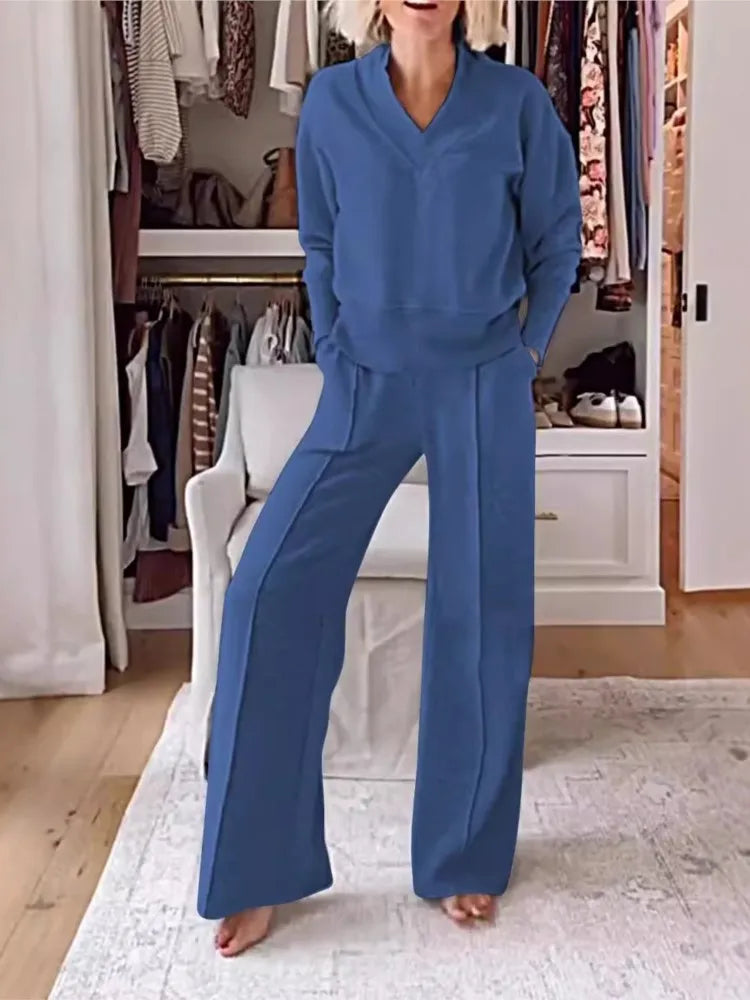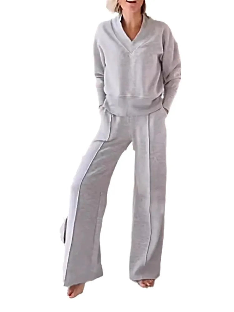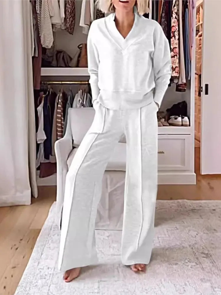 Women's Solid Color V-neck Top & Pants Two-piece Set